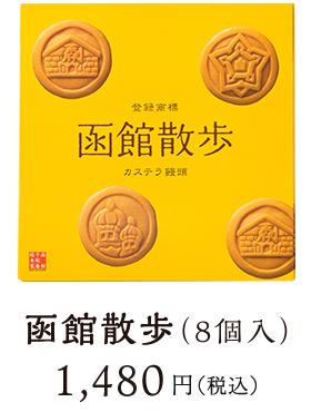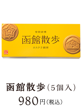 カステラ饅頭の命はおいしいあんです。厳選された小豆を職人の手で何度も丁寧に水にさらし、口溶けの良いさらりとした食感に仕上げました。また、函館は開港以来、和と洋が同居する異国情緒あふれる街。そのため牛乳やバターなど洋菓子の材料にも古くから親しみがあります。私たちは北海道産小麦の生地に牛乳を合わせることでしっとりとした生地にたどり着きました。そのこだわりの生地は小豆あんのおいしさを存分に引き立てます。和でありながらひと口食べると洋菓子のテイストを感じる、なつかしいのに新しいお菓子、それがカステラ饅頭「函館散歩」です。